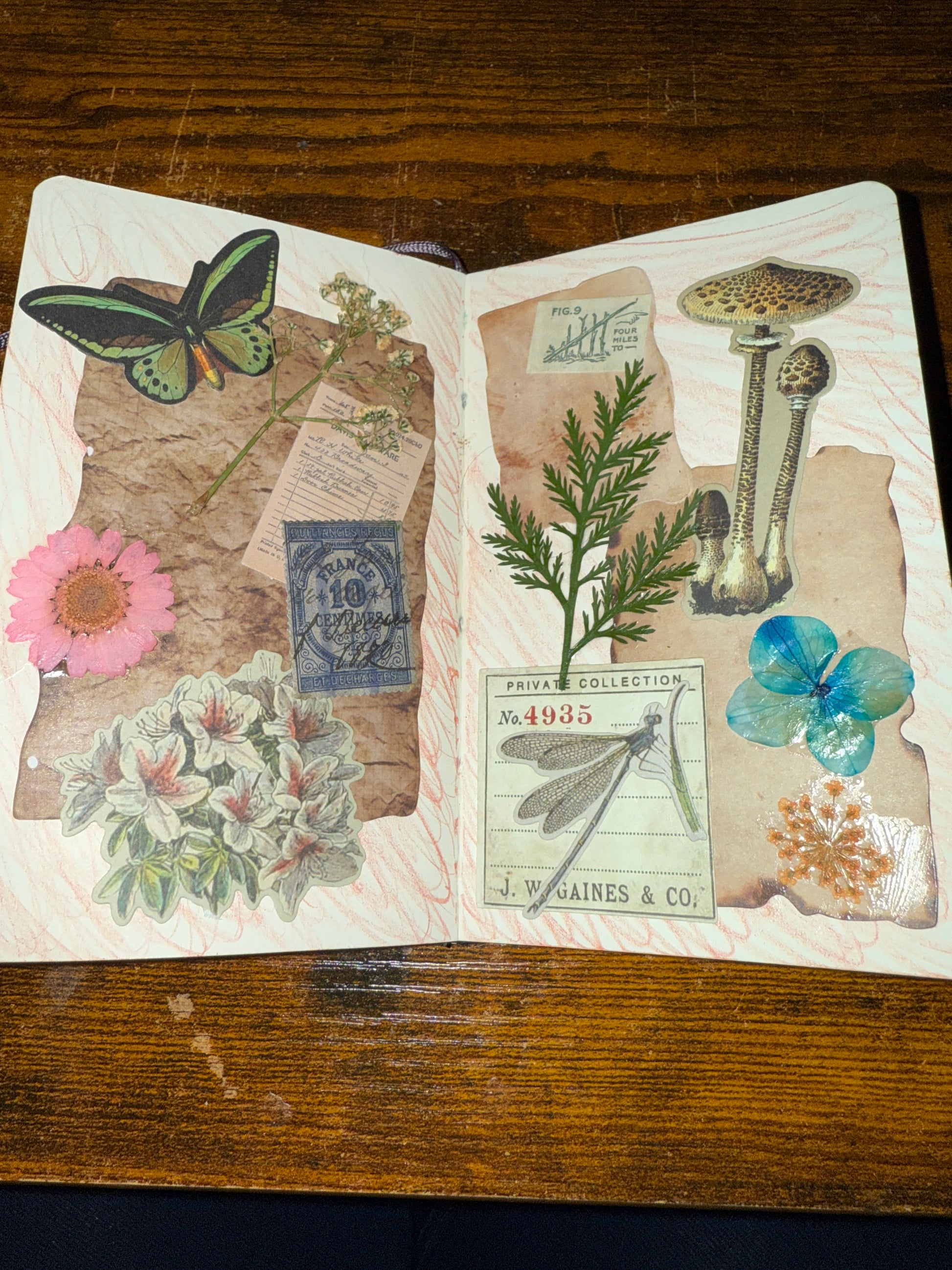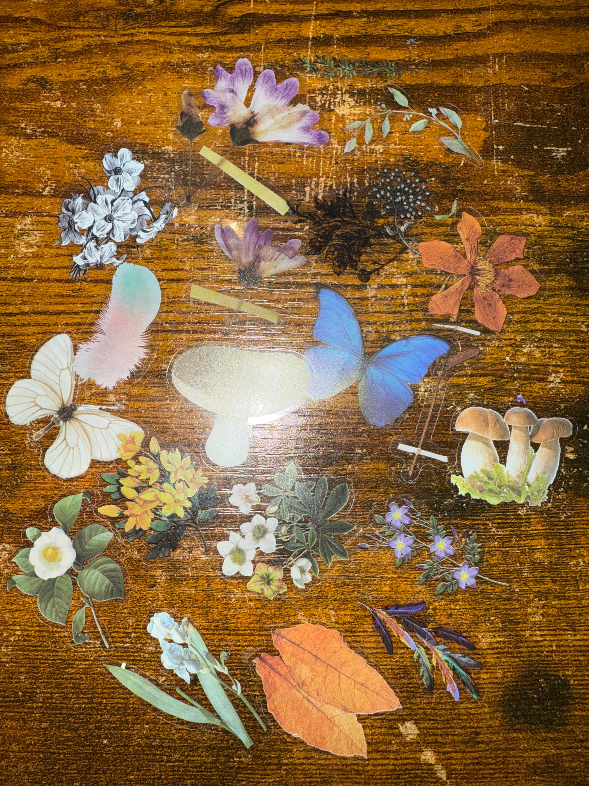 - Approx 50-60 pieces of: vintage & decorative papers, stickers, and dried flowers